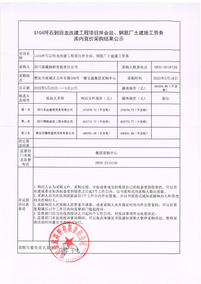 四川康藏路橋有限責任公司S104坪石到回龍改建工程項目拌合站、鋼筋廠土建施工勞務庫內競價采購結果公示