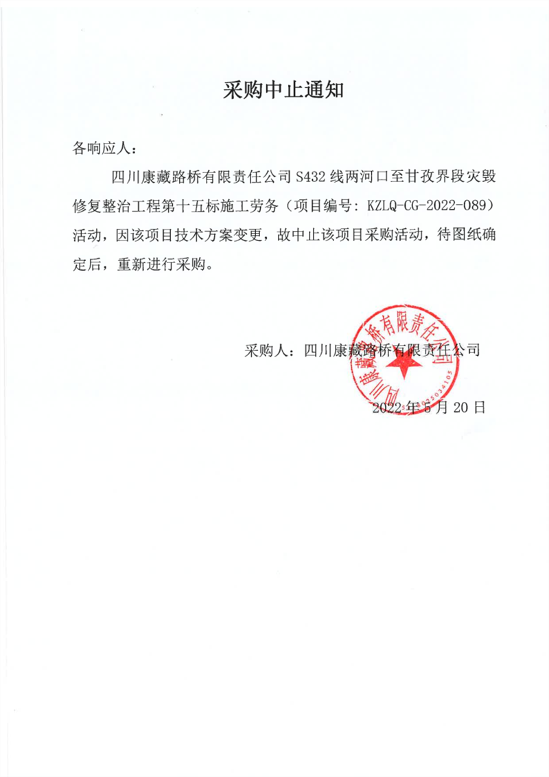 四川康藏路橋有限責(zé)任公司S432線寶興縣兩河口至甘孜界段災(zāi)毀修復(fù)整治工程第十五標(biāo)施工勞務(wù)采購中止通知