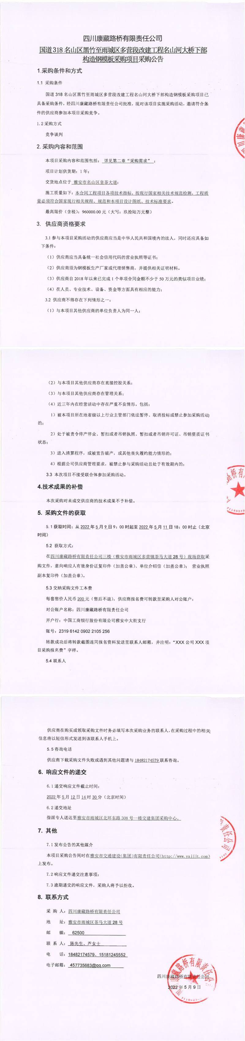 四川康藏路橋有限責(zé)任公司國(guó)道318名山區(qū)黑竹至雨城區(qū)多營(yíng)段改建工程名山河大橋下部構(gòu)造鋼模塊采購(gòu)項(xiàng)目采購(gòu)公告