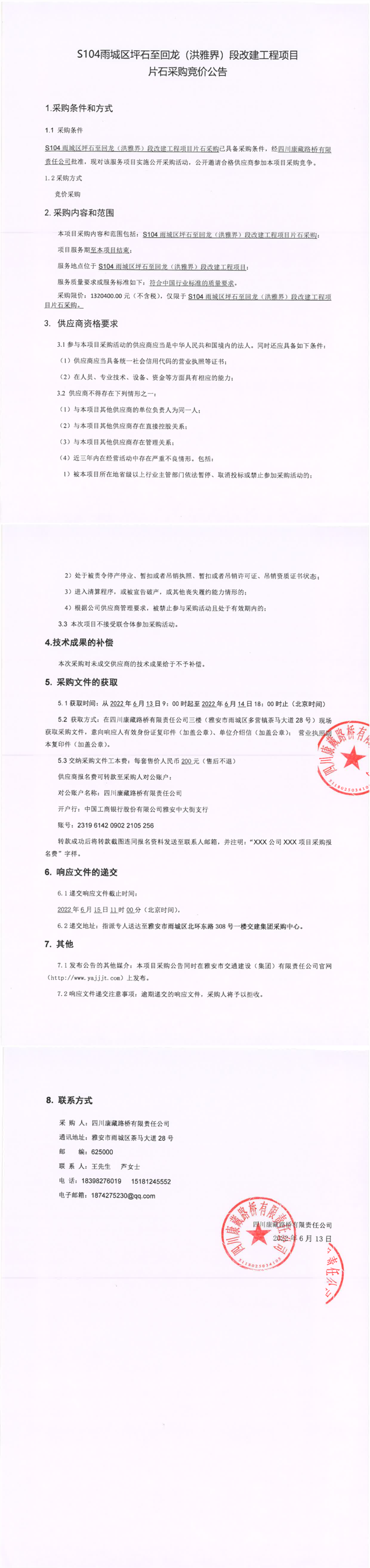 四川康藏路橋有限責(zé)任公司S104雨城區(qū)坪石至回龍(洪雅界)段改建工程項(xiàng)目片石采購競(jìng)價(jià)公告