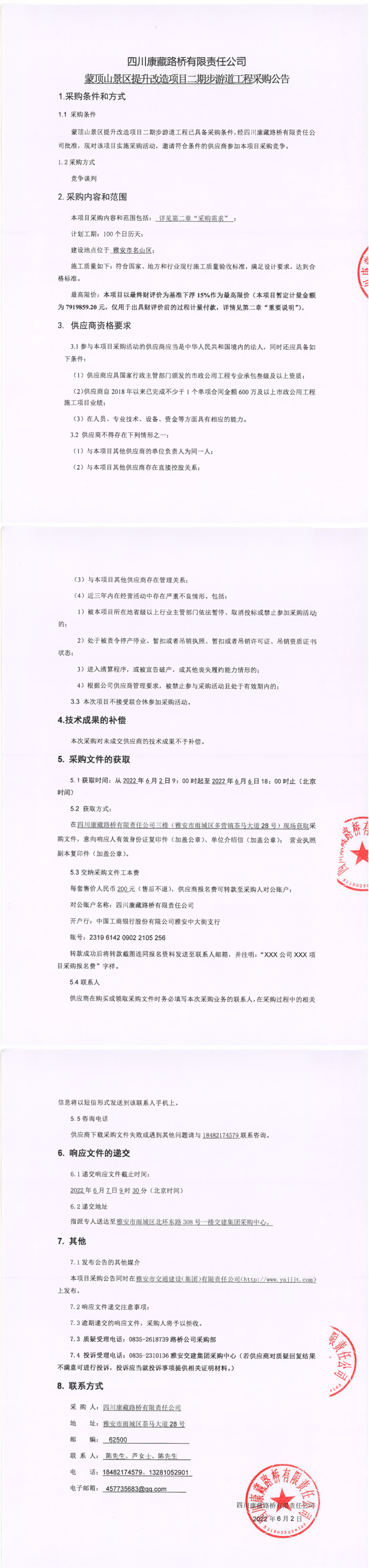 四川康藏路橋有限責(zé)任公司蒙頂山景區(qū)提升改造項目二期步游道工程采購公告