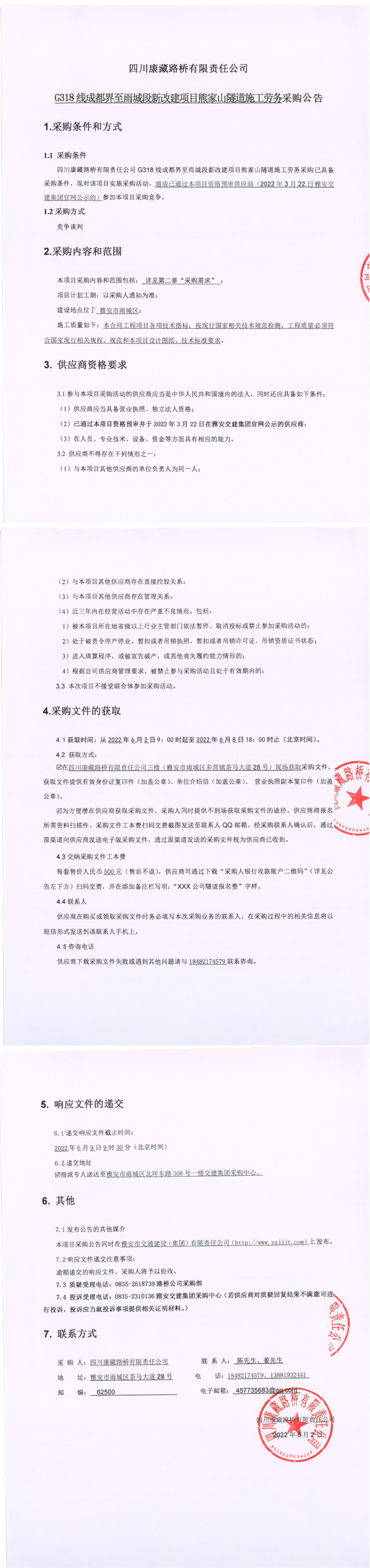 四川康藏路橋有限責(zé)任公司G318線(xiàn)成都界至雨城段新改建項(xiàng)目熊家山隧道施工勞務(wù)采購(gòu)公告