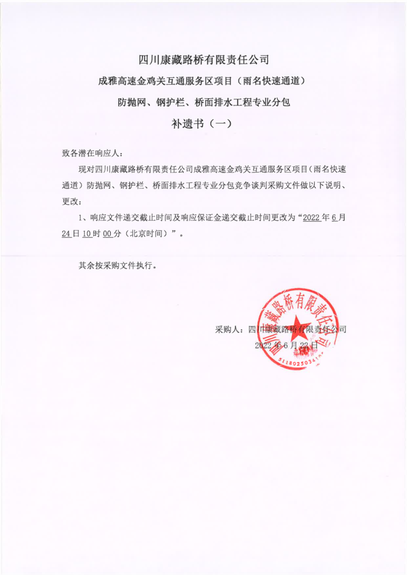 四川康藏路橋有限責任公司成雅高速金雞關(guān)互通服務區(qū)項目(雨名快速通道)防拋網(wǎng)、鋼護欄、橋面排水工程專業(yè)分包補遺書(一)