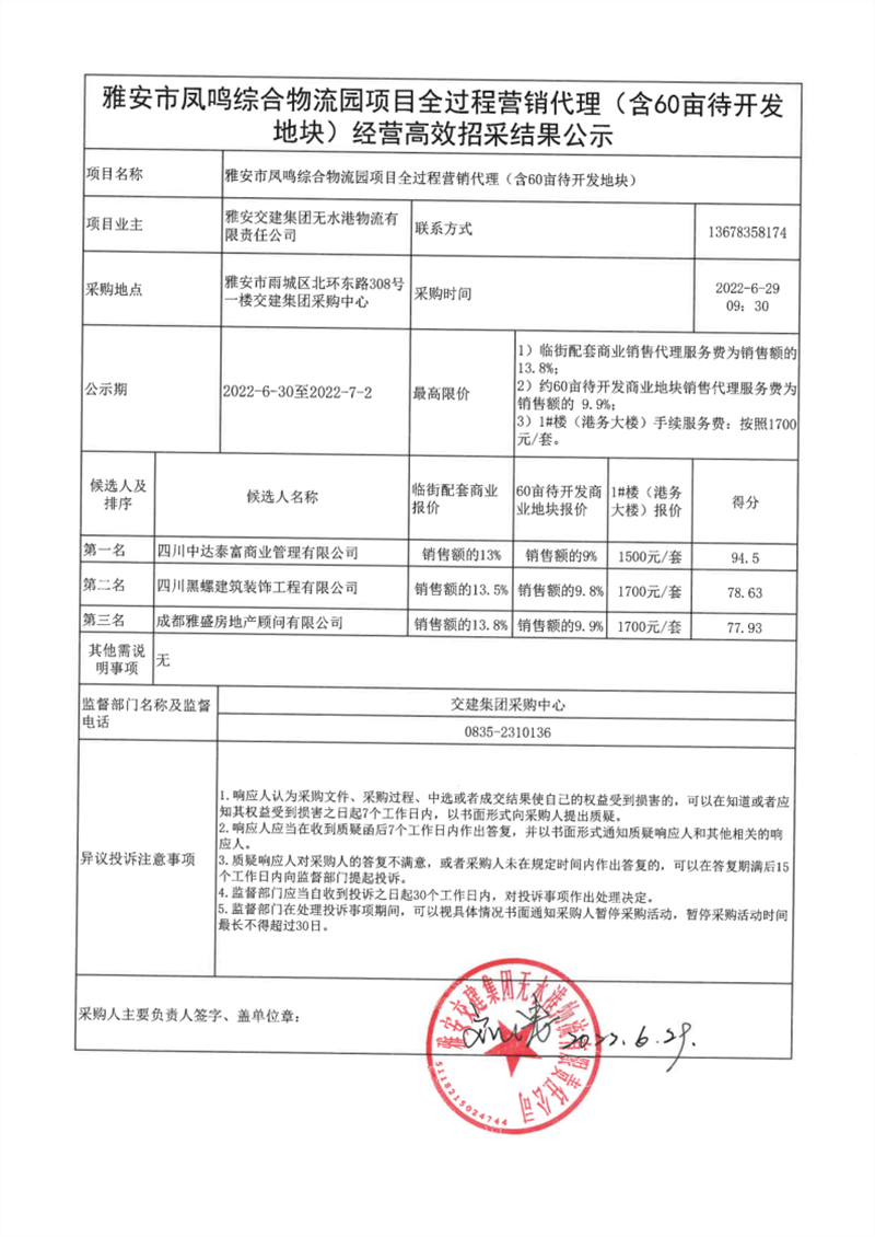 雅安交建集團(tuán)無(wú)水港物流有限責(zé)任公司雅安市鳳鳴綜合物流園項(xiàng)目全過(guò)程營(yíng)銷代理(含60畝待開發(fā)地塊)經(jīng)營(yíng)高效招采結(jié)果公示