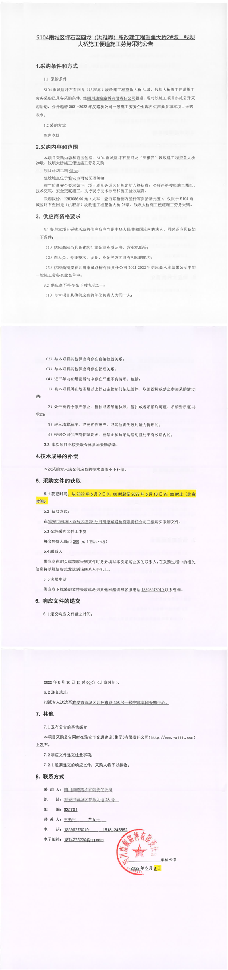 四川康藏路橋有限責任公司S104雨城區(qū)坪石至回龍(洪雅界)段改建工程望魚大橋2#墩、錢壩大橋施工便道施工勞務(wù)采購公告