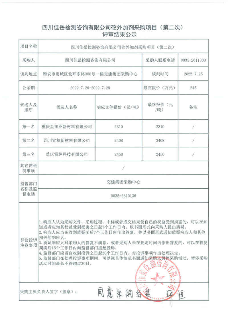 四川佳岳檢測咨詢有限公司砼外加劑采購項目(第二次)評審結果公示