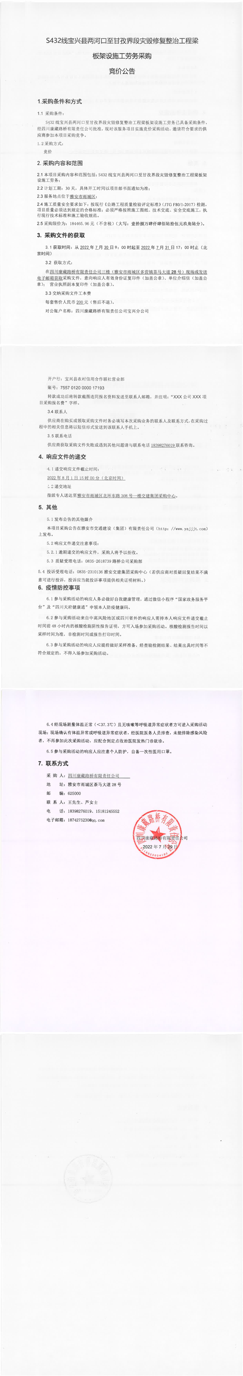 四川康藏路橋有限責(zé)任公司S432線寶興縣兩河口至甘孜界段災(zāi)毀修復(fù)整治工程梁板架設(shè)施工勞務(wù)采購競(jìng)價(jià)公告