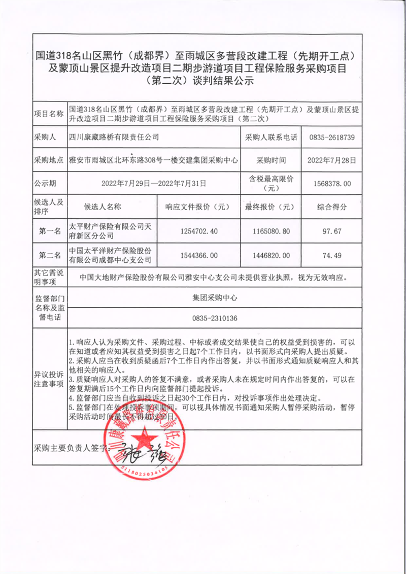 四川康藏路橋有限責任公司國道318名山區(qū)黑竹(成都界)至雨城區(qū)多營段改建工程(先期開工點)及蒙頂山景區(qū)提升改造項目二期步游道項目工程保險服務采購項目(第二次)談判結(jié)果公示