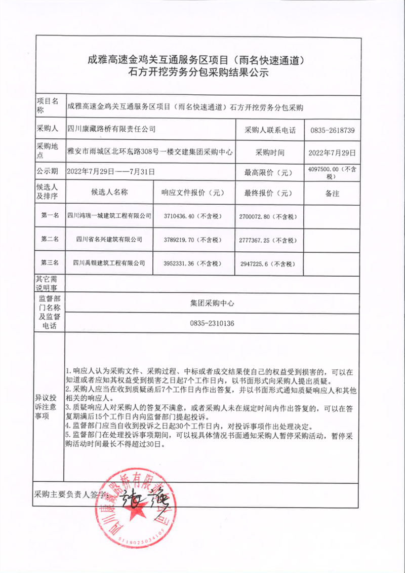 四川康藏路橋有限責任公司成雅高速金雞關互通服務區(qū)項目(雨名快速通道)石方開挖勞務分包采購結果公示