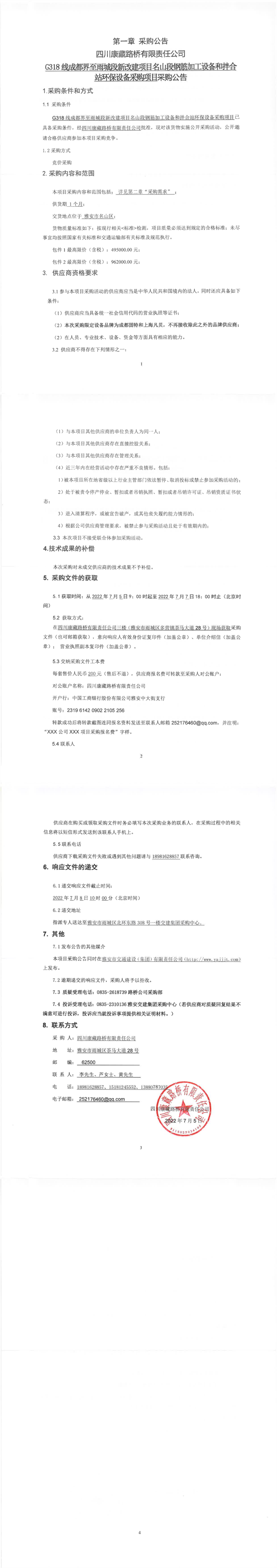 四川康藏路橋有限責(zé)任公司G318線(xiàn)成都界至雨城段新改建項(xiàng)目名山段鋼筋加工設(shè)備和拌合站環(huán)保設(shè)備采購(gòu)項(xiàng)目采購(gòu)公告