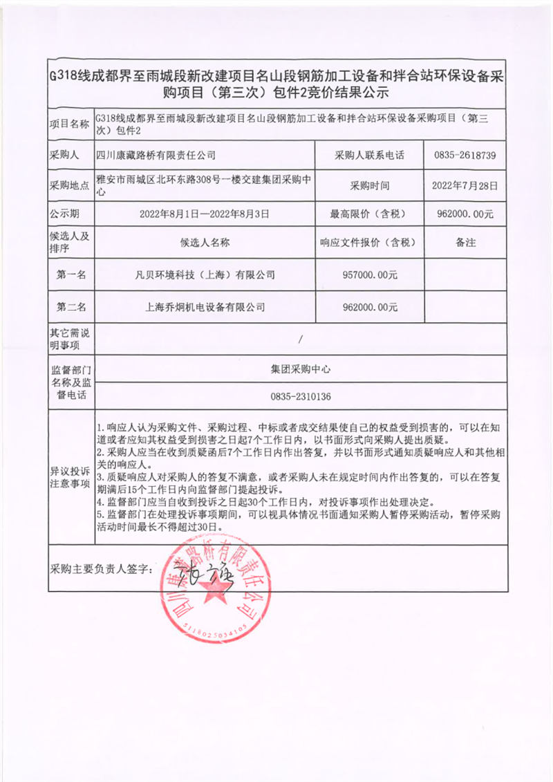 四川康藏路橋有限責(zé)任公司G318線成都界至雨城段新改建項(xiàng)目名山段鋼筋加工設(shè)備和拌合站環(huán)保設(shè)備采購項(xiàng)目(第三次)包件2競價結(jié)果公示