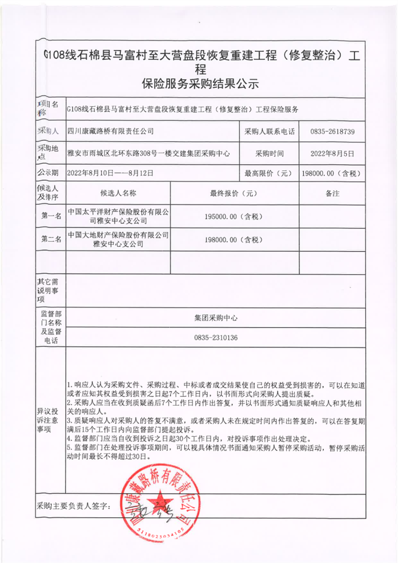 四川康藏路橋有限責(zé)任公司G108線石棉縣馬富村至大營盤段恢復(fù)重建工程(修復(fù)整治)工程保險服務(wù)采購結(jié)果公示