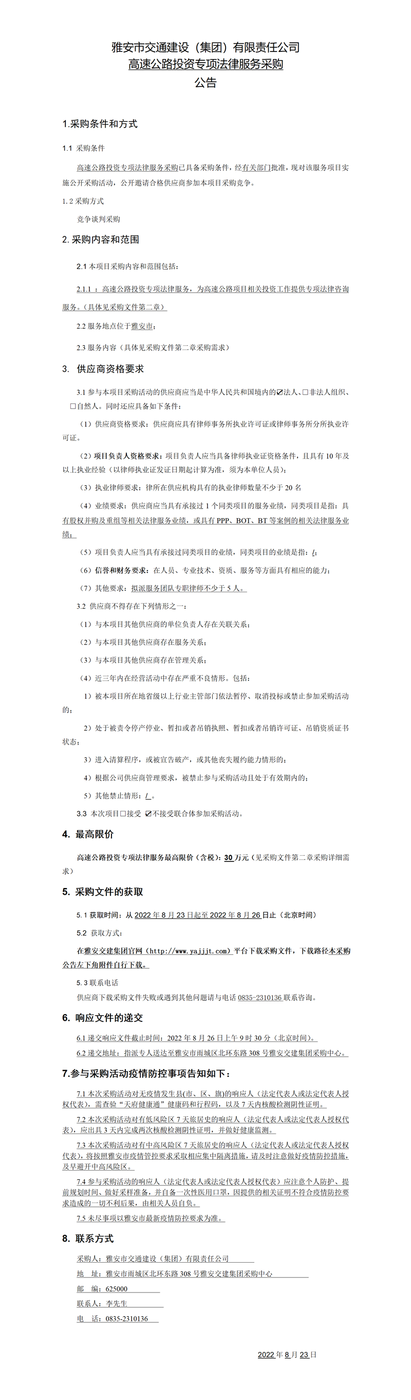 雅安市交通建設(shè)(集團(tuán))有限責(zé)任公司高速公路投資專項(xiàng)法律服務(wù)采購公告