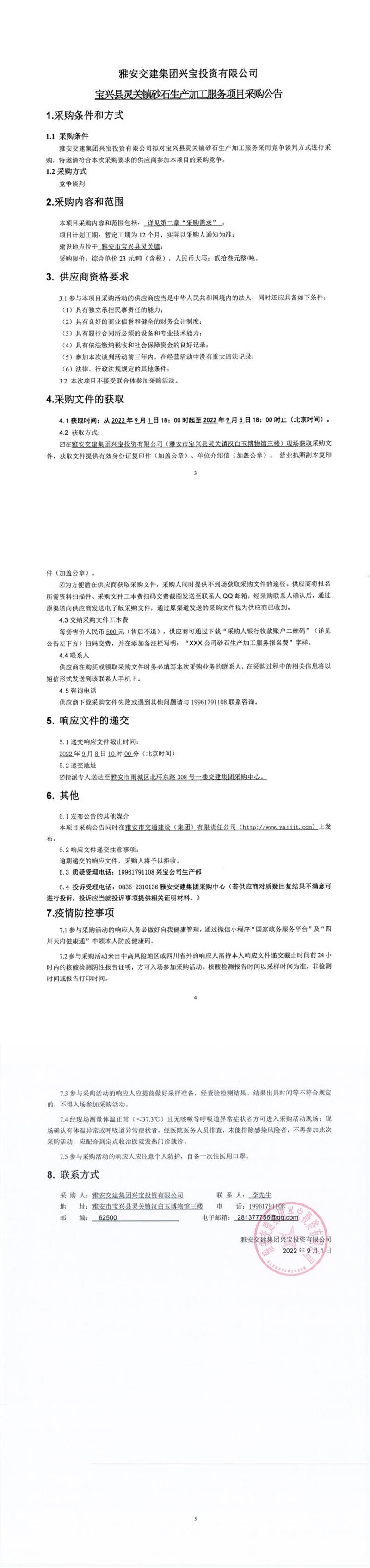 雅安交建集團(tuán)興寶投資有限公司寶興縣靈關(guān)鎮(zhèn)砂石生產(chǎn)加工服務(wù)項目采購公告