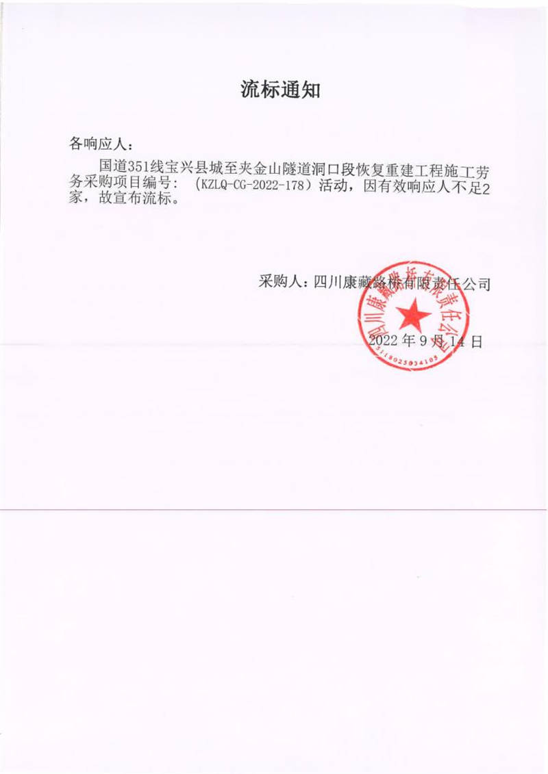 四川康藏路橋有限責(zé)任公司國道351線寶興縣城至夾金山隧道洞口段恢復(fù)重建工程施工勞務(wù)采購流標(biāo)通知