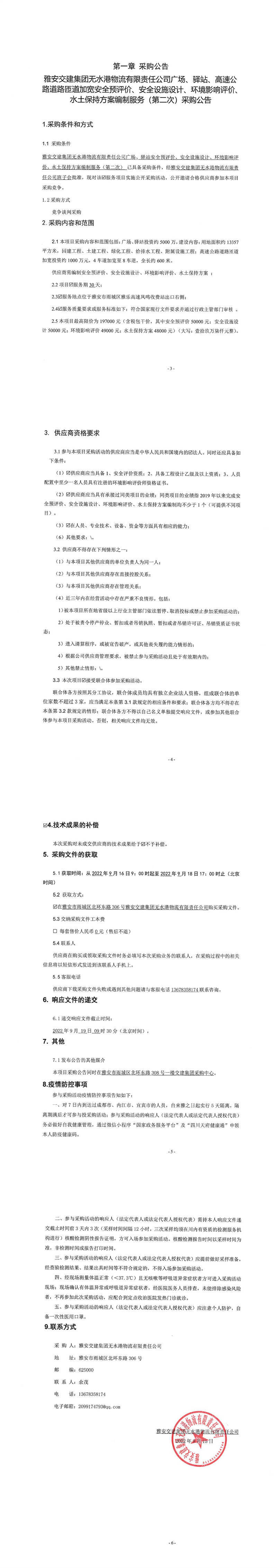 雅安交建集團(tuán)無水港物流有限責(zé)任公司廣場、驛站、高速公路道路匝道加寬安全預(yù)評價(jià)、安全設(shè)施設(shè)計(jì)、環(huán)境影響評價(jià)、水土保持方案編制服務(wù)(第二次)采購公告