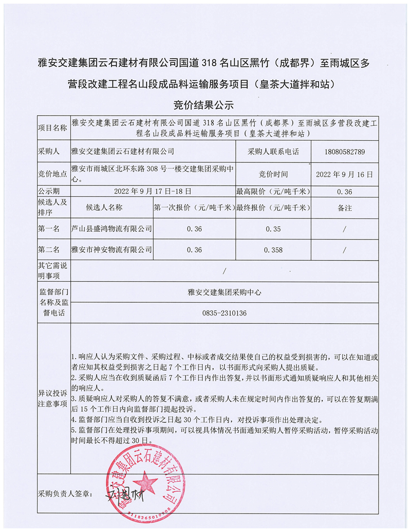 雅安交建集團云石建材有限公司國道318名山區(qū)黑竹(成都界)至雨城區(qū)多營段改建工程雨城段成品料運輸服務項目(皇茶大道拌和站)競價結果公示