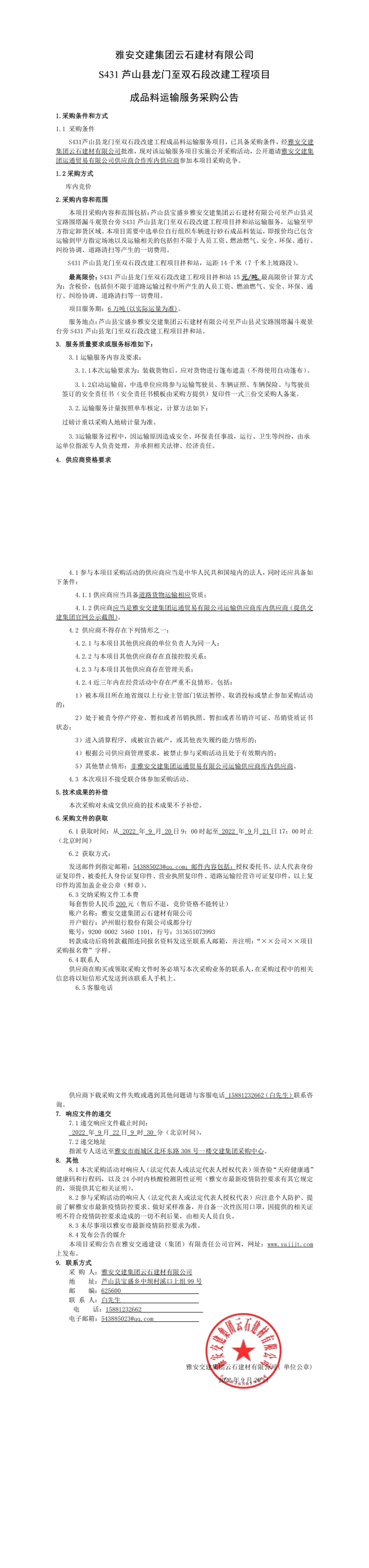 雅安交建集團(tuán)云石建材有限公司S431蘆山縣龍門(mén)至雙石段改建工程項(xiàng)目成品料運(yùn)輸服務(wù)采購(gòu)公告