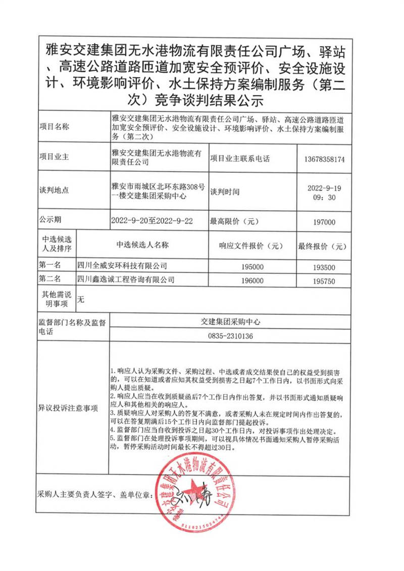雅安交建集團無水港物流有限責任公司廣場、驛站、高速公路道路匝道加寬安全預評價、安全設施設計、環(huán)境影響評價、水土保持方案編制服務(第二次)競爭談判結果公示