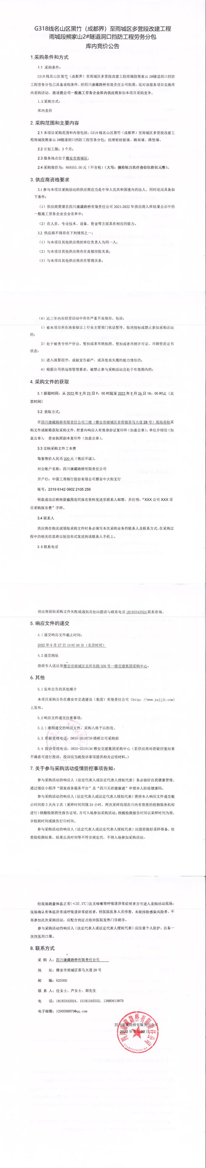 四川康藏路橋有限責(zé)任公司G318線名山區(qū)黑竹(成都界)至雨城區(qū)多營段改建工程雨城段熊家山2#隧道洞口擋防工程勞務(wù)分包庫內(nèi)競價公告