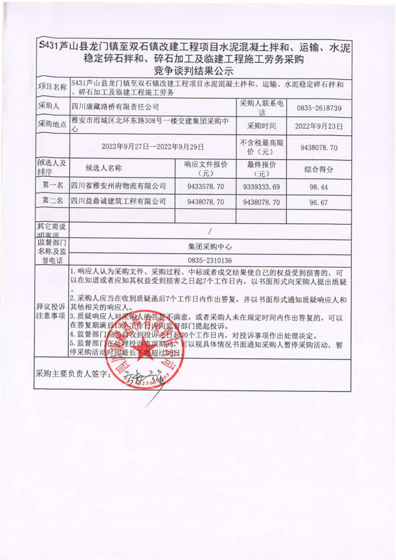 四川康藏路橋有限責(zé)任公司S431蘆山縣龍門鎮(zhèn)至雙石鎮(zhèn)改建工程項(xiàng)目水泥混凝土拌和、運(yùn)輸、水泥穩(wěn)定碎石拌和、碎石加工及臨建工程施工勞務(wù)采購競爭談判結(jié)果公示