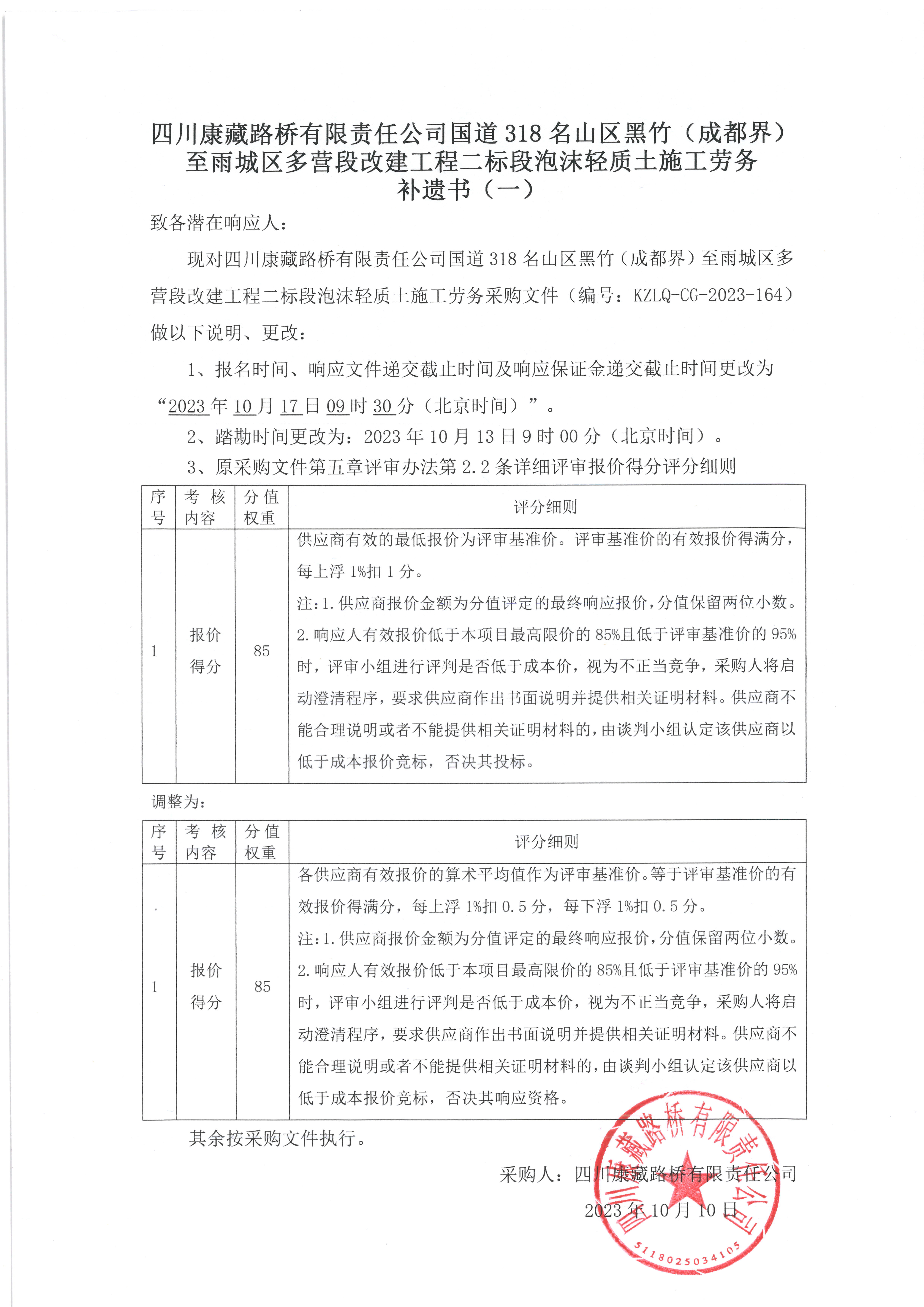 四川康藏路橋有限責(zé)任公司國(guó)道318名山區(qū)黑竹(成都界)至雨城區(qū)多營(yíng)段改建工程二標(biāo)段泡沫輕質(zhì)土施工勞務(wù)補(bǔ)遺書(shū)(一)