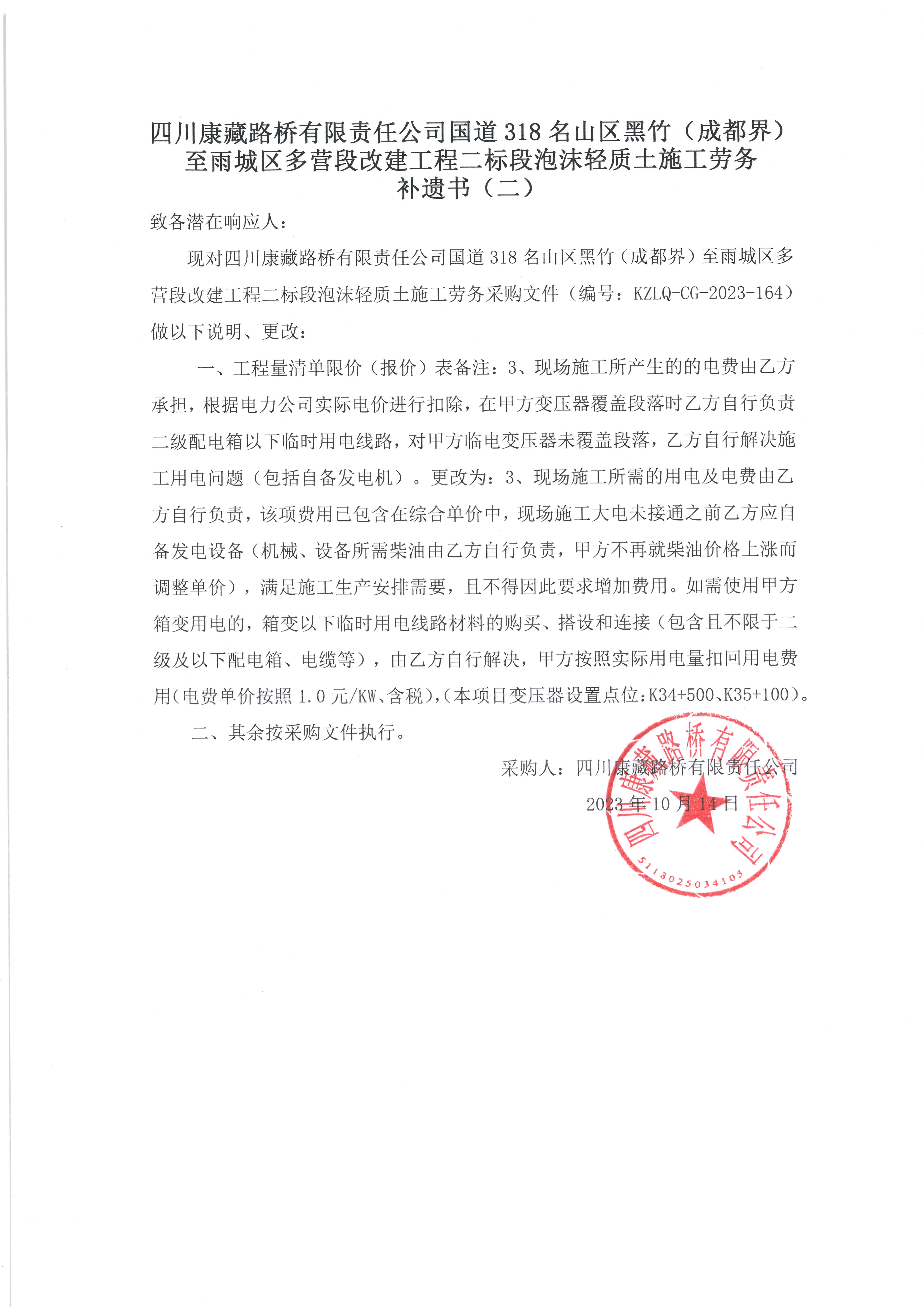 四川康藏路橋有限責(zé)任公司國道318名山區(qū)黑竹(成都界)至雨城區(qū)多營段改建工程二標(biāo)段泡沫輕質(zhì)土施工勞務(wù) 補遺書(二)