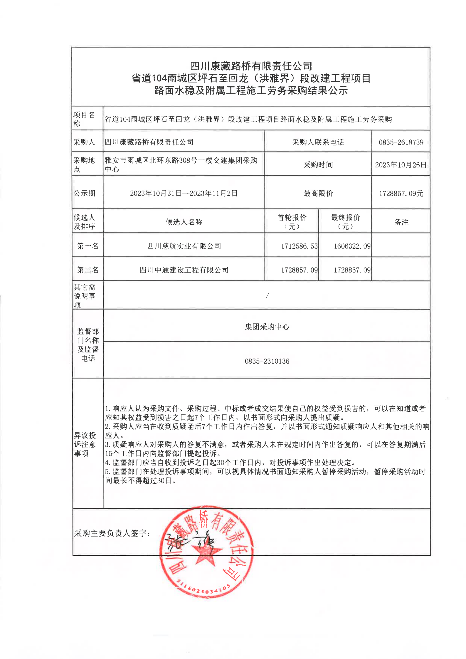 四川康藏路橋有限責(zé)任公司省道104雨城區(qū)坪石至回龍(洪雅界)段改建工程項(xiàng)目路面水穩(wěn)及附屬工程施工勞務(wù)采購結(jié)果公示