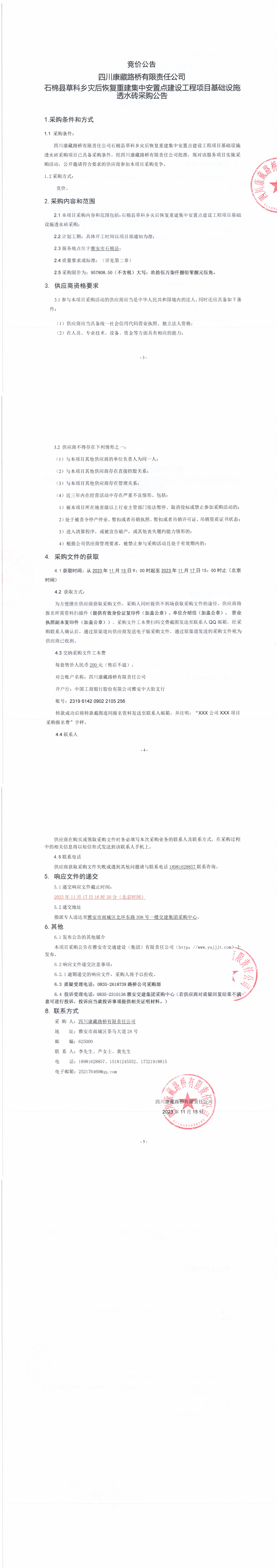 四川康藏路橋有限責(zé)任公司石棉縣草科鄉(xiāng)災(zāi)后恢復(fù)重建集中安置點(diǎn)建設(shè)工程項(xiàng)目基礎(chǔ)設(shè)施透水磚采購(gòu)公告