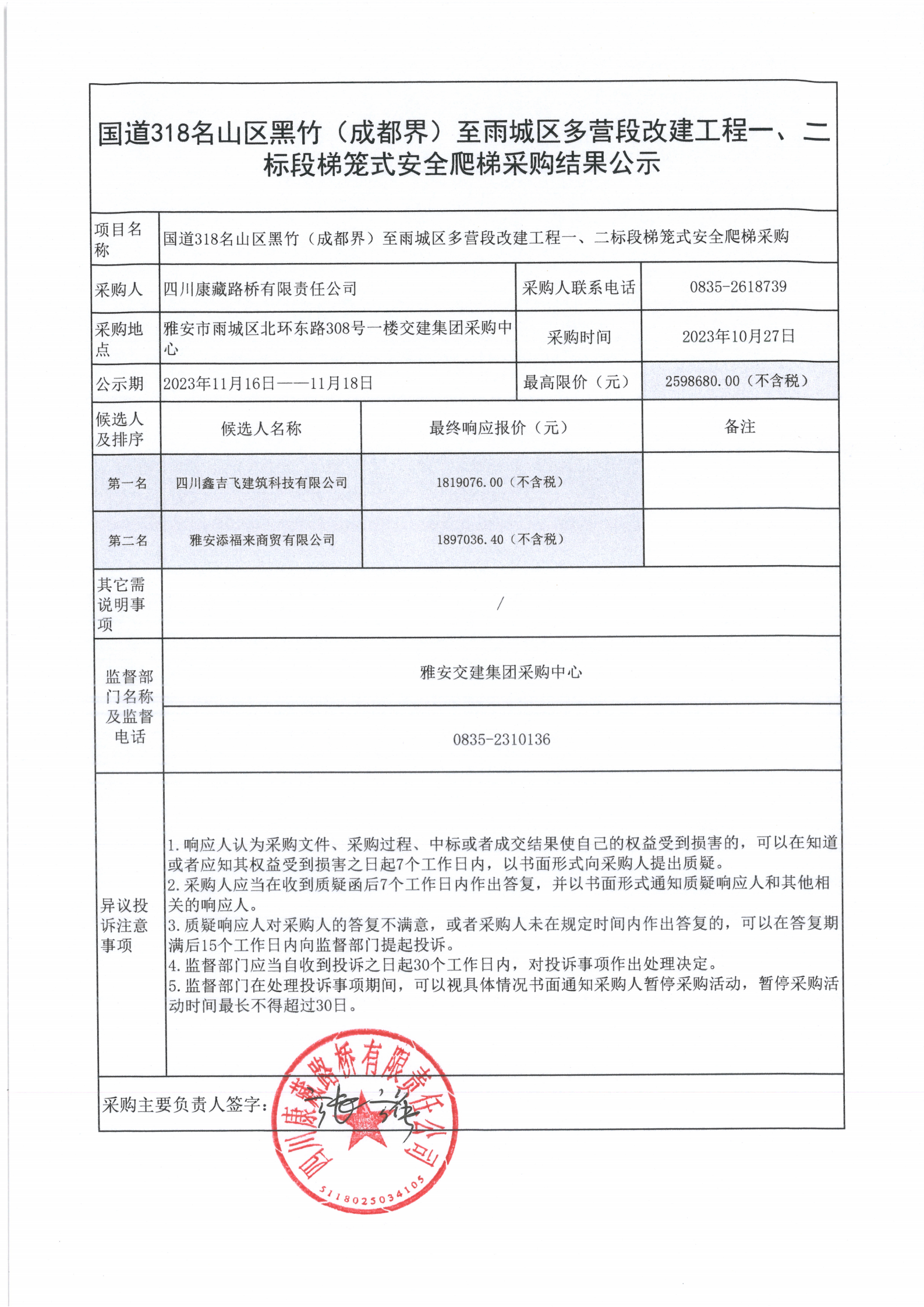 四川康藏路橋有限責任公司國道318名山區(qū)黑竹(成都界)至雨城區(qū)多營段改建工程一、二標段梯籠式安全爬梯采購結果公示