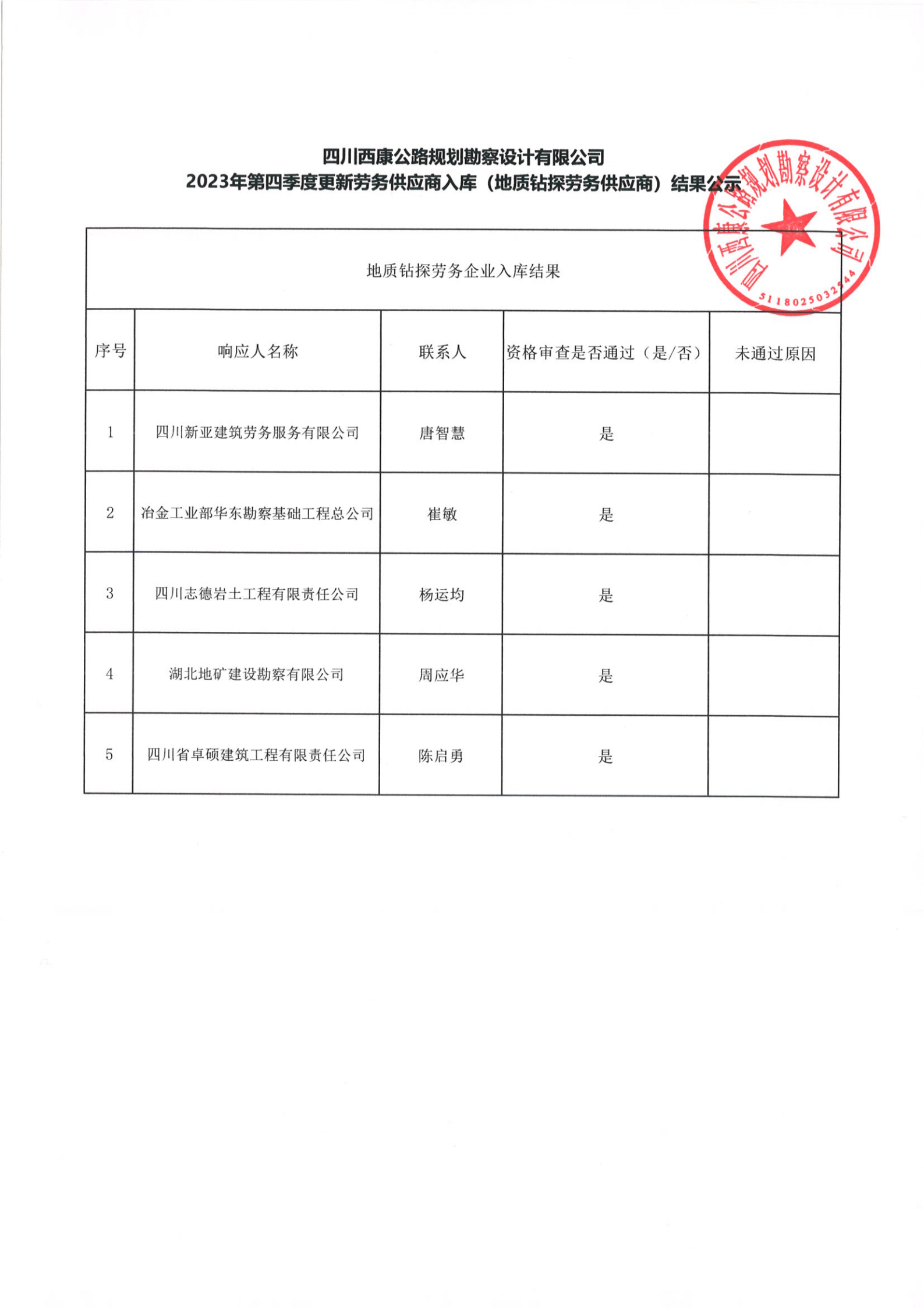 四川西康公路規(guī)劃勘察設(shè)計(jì)有限公司2023年第四季度更新勞務(wù)供應(yīng)商入庫(地質(zhì)鉆探勞務(wù)供應(yīng)商)結(jié)果公示