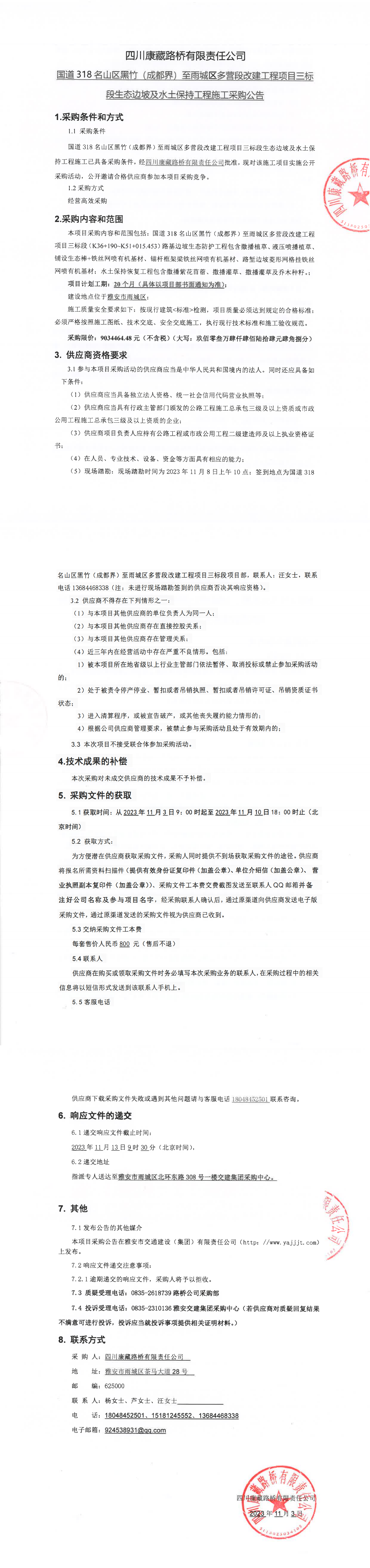 四川康藏路橋有限責任公司國道318名山區(qū)黑竹(成都界)至雨城區(qū)多營段改建工程項目三標段生態(tài)邊坡及水土保持工程施工采購公告