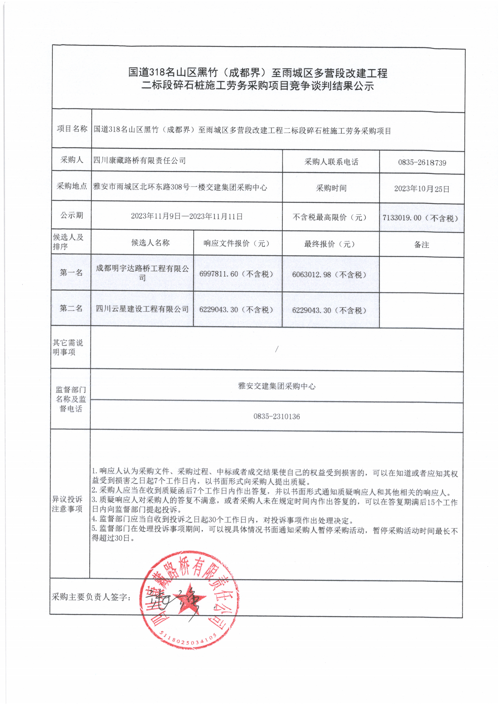 四川康藏路橋有限責(zé)任公司國道318名山區(qū)黑竹(成都界)至雨城區(qū)多營段改建工程二標(biāo)段碎石樁施工勞務(wù)采購項(xiàng)目競(jìng)爭(zhēng)談判結(jié)果公示