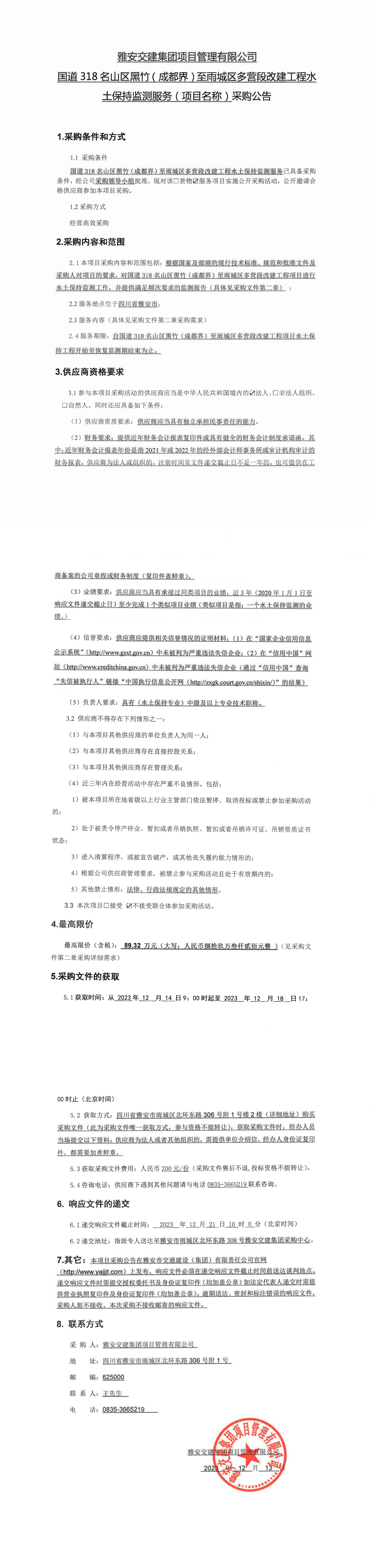 雅安交建集團(tuán)項(xiàng)目管理有限公司國道318名山區(qū)黑竹(成都界)至雨城區(qū)多營段改建工程水土保持監(jiān)測服務(wù)(項(xiàng)目名稱)采購公告