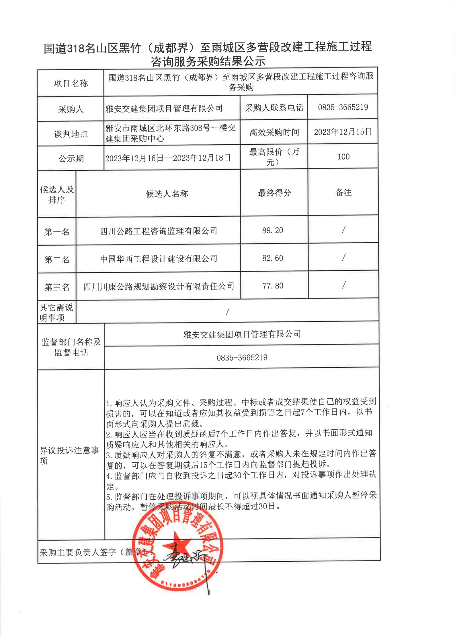 雅安交建集團(tuán)項(xiàng)目管理有限公司國道318名山區(qū)黑竹(成都界)至雨城區(qū)多營段改建工程施工過程咨詢服務(wù)采購結(jié)果公示