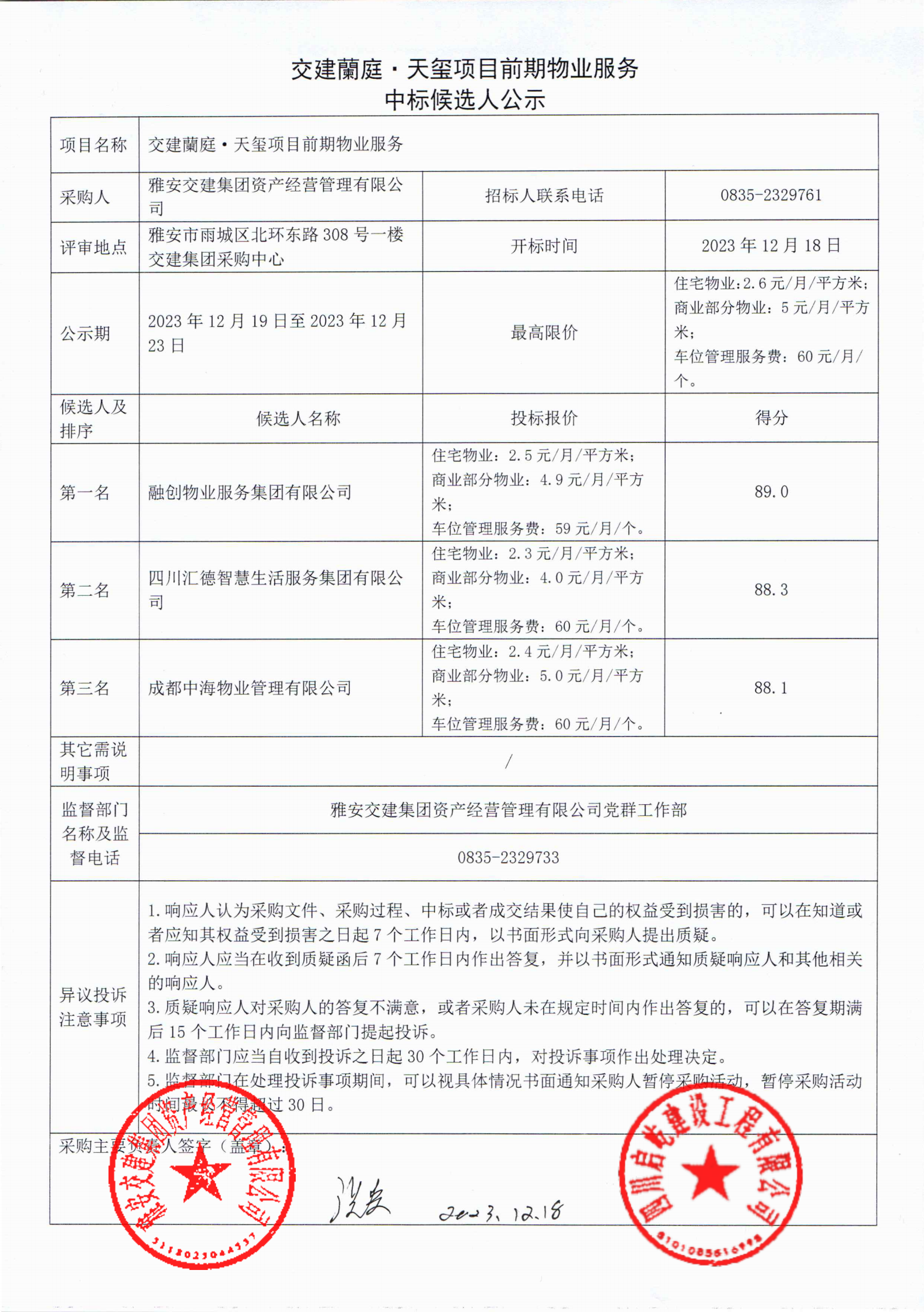 雅安交建集團(tuán)資產(chǎn)經(jīng)營(yíng)管理有限公司交建蘭庭·天璽項(xiàng)目前期物業(yè)服務(wù)中標(biāo)候選人公示