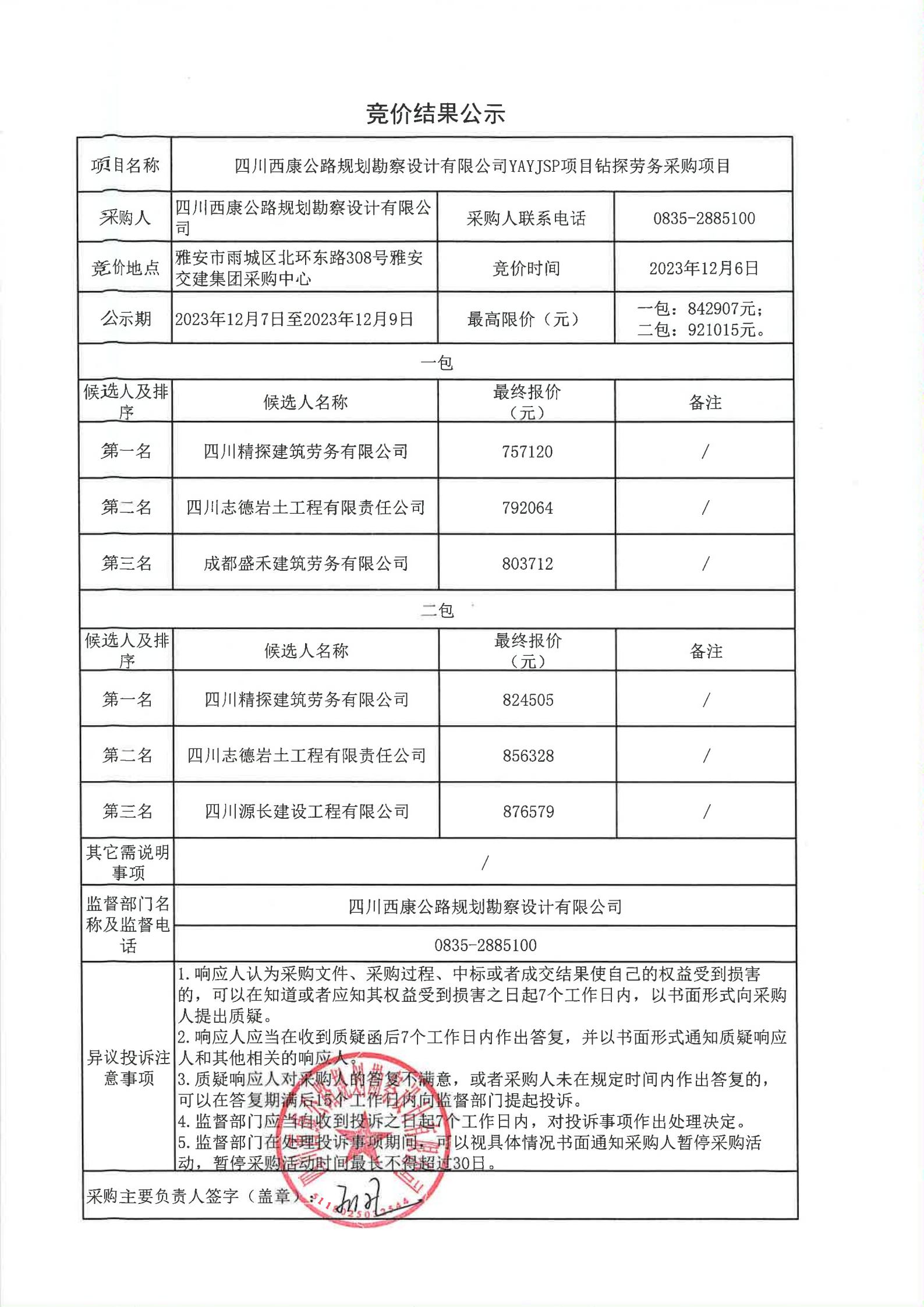 四川西康公路規(guī)劃勘察設(shè)計(jì)公司YAYJSP項(xiàng)目鉆探勞務(wù)采購項(xiàng)目競價結(jié)果公示