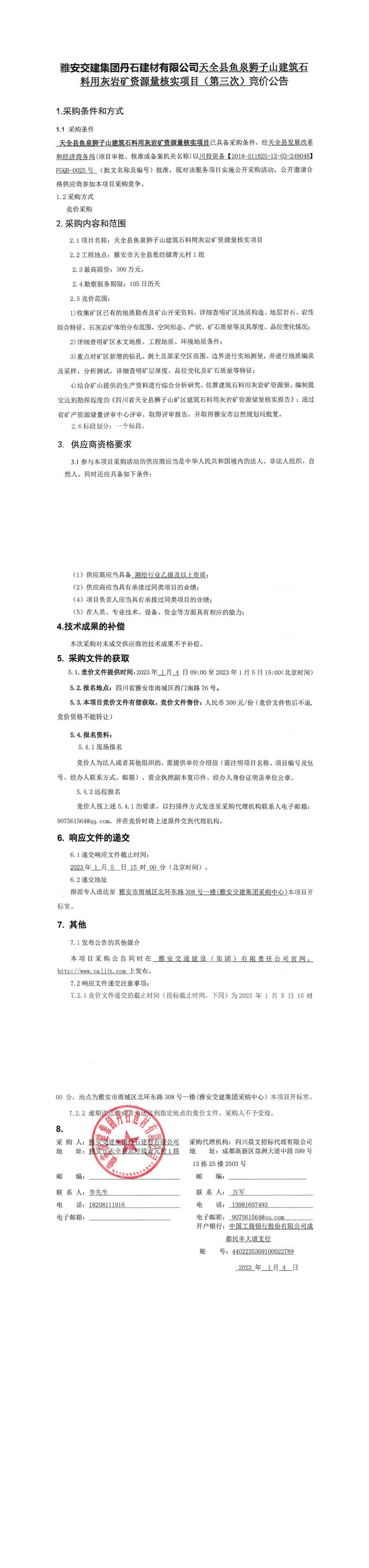 雅安交建集團丹石建材有限公司天全縣魚泉獅子山建筑石料用灰?guī)r礦資源量核實項目(第三次)競價公告