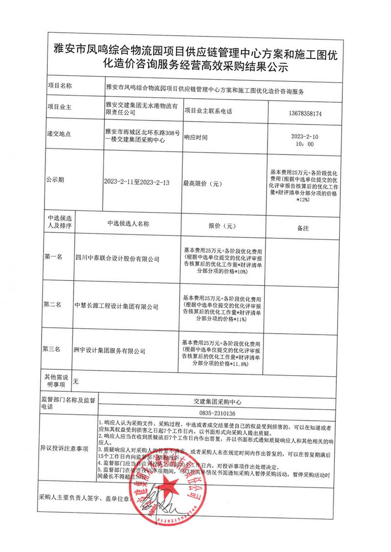 雅安交建集團無水港物流有限責任公司雅安市鳳鳴綜合物流園項目供應鏈管理中心方案和施工圖優(yōu)化造價咨詢服務經營高效采購結果公示
