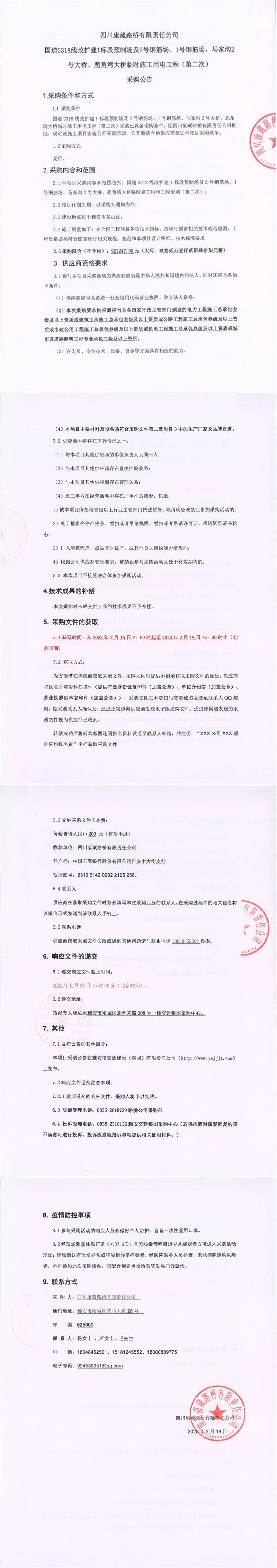 四川康藏路橋有限責(zé)任公司國道G318線改擴(kuò)建1標(biāo)段預(yù)制場及2號鋼筋場、1號鋼筋場、馬家溝2號大橋、鹿角灣大橋臨時(shí)施工用電工程(第二次)采購公告