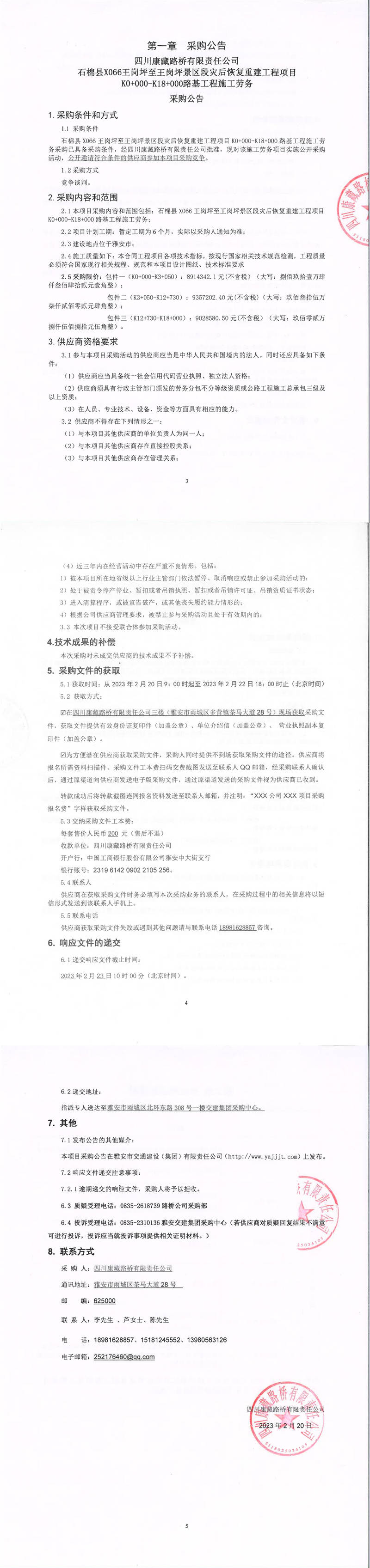 四川康藏路橋有限責任公司石棉縣X066王崗坪至王崗坪景區(qū)段災后恢復重建工程項目土石方工程、排水工程、邊坡治理工程、防護工程施工勞務采購公告