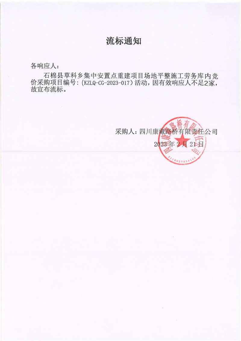 四川康藏路橋有限責任公司石棉草科鄉(xiāng)集中安置點重建項目場地平整施工勞務庫內(nèi)競價流標通知