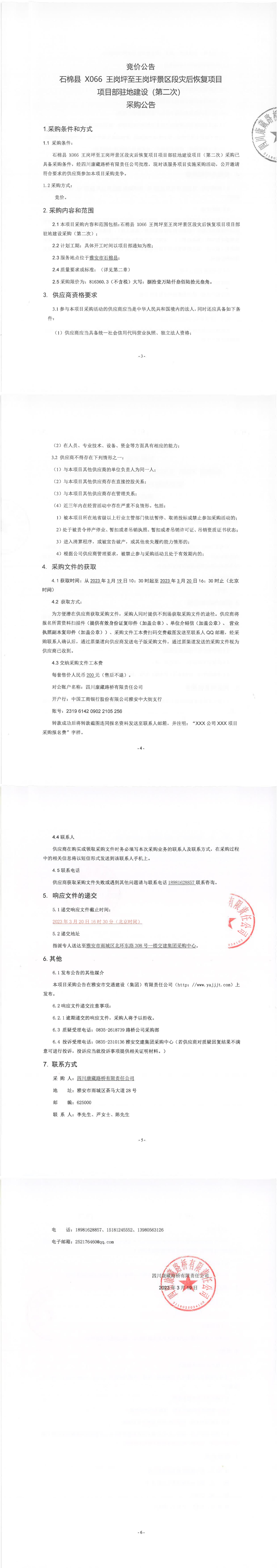 四川康藏路橋有限責任公司石棉縣X066王崗坪至王崗坪景區(qū)段災(zāi)后恢復(fù)項目項目部駐地建設(shè)(第二次)采購公告