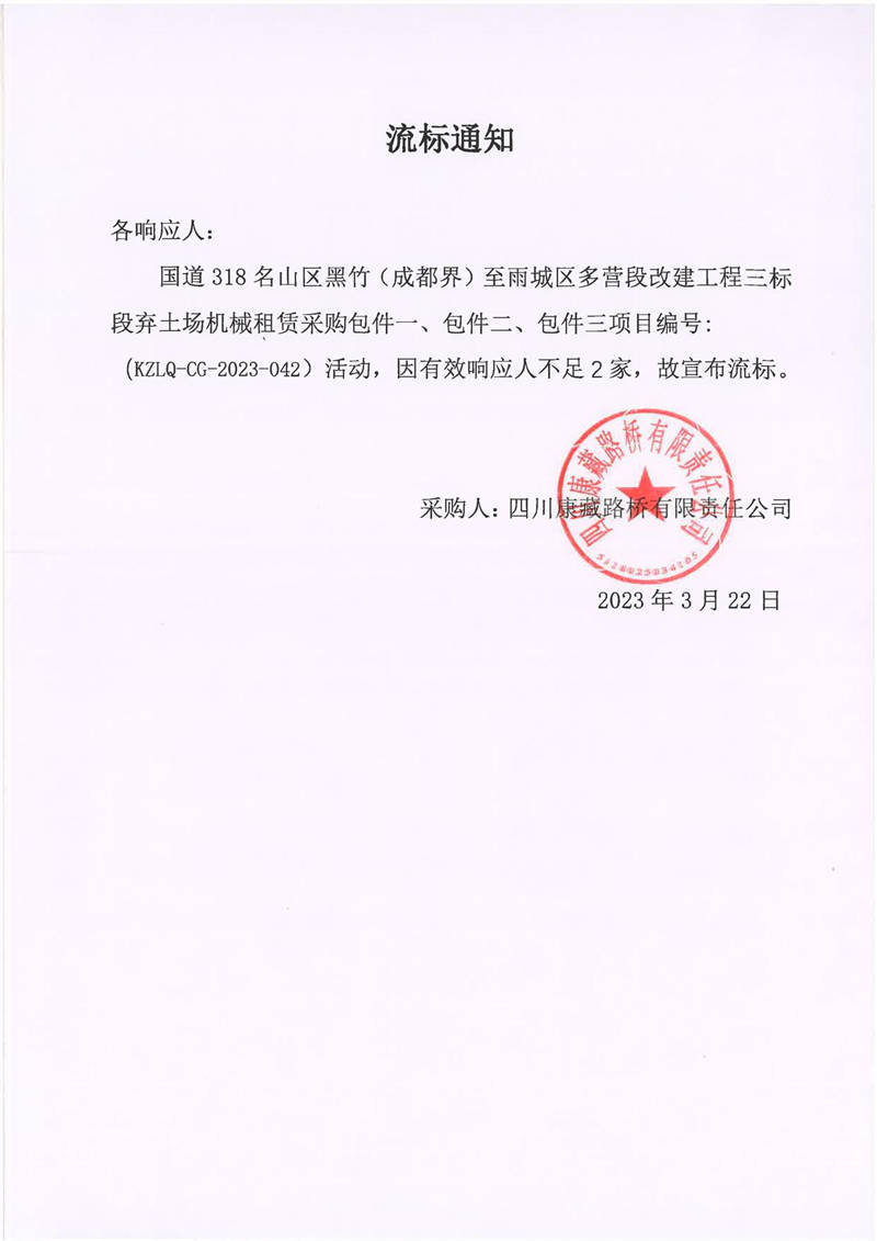 四川康藏路橋有限責(zé)任公司國道318名山區(qū)黑竹(成都界)至雨城區(qū)多營段改建工程三標(biāo)段棄土場機械租賃采購流標(biāo)通知