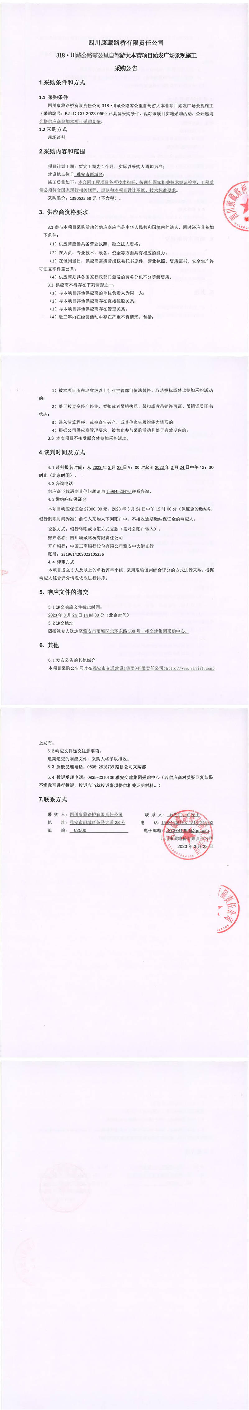 四川康藏路橋有限責(zé)任公司318·川藏公路零公里自駕游大本營(yíng)項(xiàng)目始發(fā)廣場(chǎng)景觀(guān)施工采購(gòu)公告