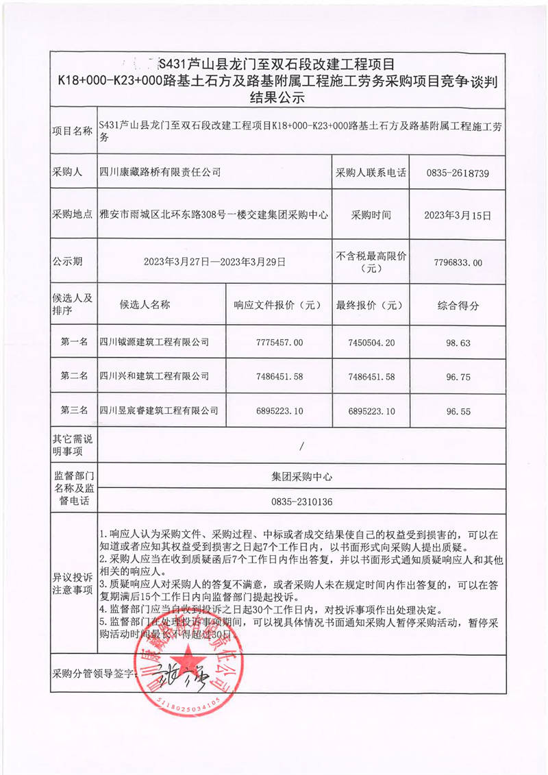 四川康藏路橋有限責(zé)任公司S431蘆山縣龍門(mén)至雙石段改建工程項(xiàng)目K18+000-K23+000路路基附屬工程施工勞務(wù)采購(gòu)項(xiàng)目競(jìng)爭(zhēng)談判結(jié)果公示