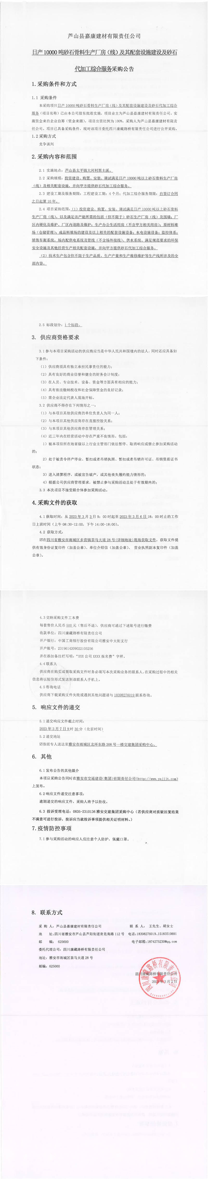 蘆山縣嘉康嘉康建材有限責(zé)任公司日產(chǎn)10000噸砂石骨料生產(chǎn)廠房(線)及其配套設(shè)施建設(shè)及砂石代加工綜合服務(wù)采購公告