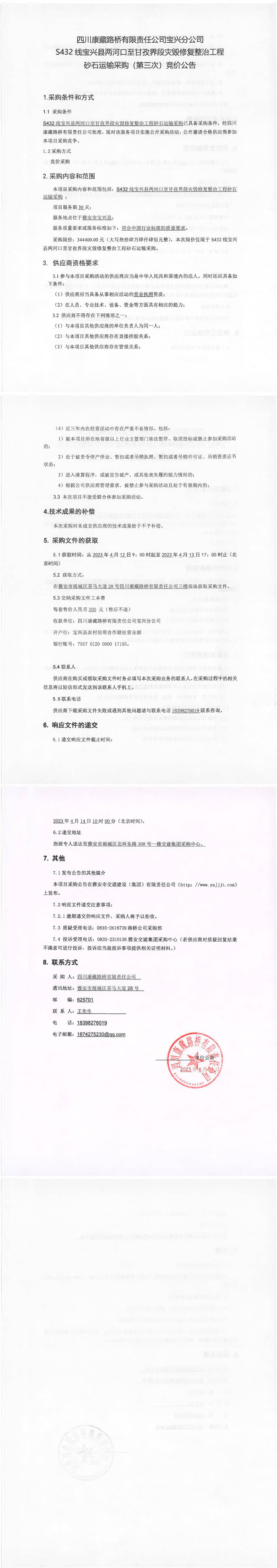 四川康藏路橋有限責(zé)任公司寶興分公司S432寶興縣兩河口至甘孜界段災(zāi)毀修復(fù)整治工程砂石運(yùn)輸采購(第三次)競價(jià)公告