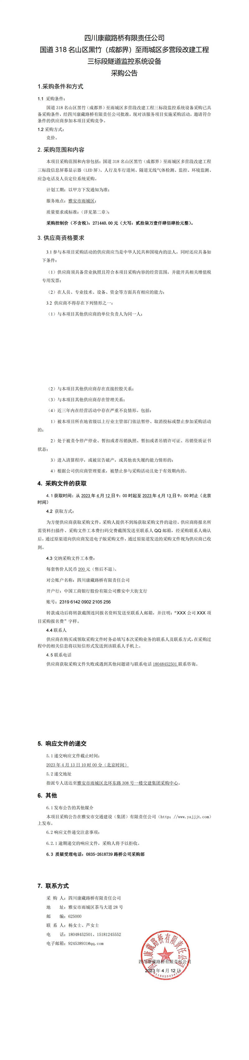 四川康藏路橋有限責(zé)任公司國道318名山區(qū)黑竹(成都界)至雨城區(qū)多營段改建工程三標(biāo)段隧道監(jiān)控系統(tǒng)設(shè)備采購公告