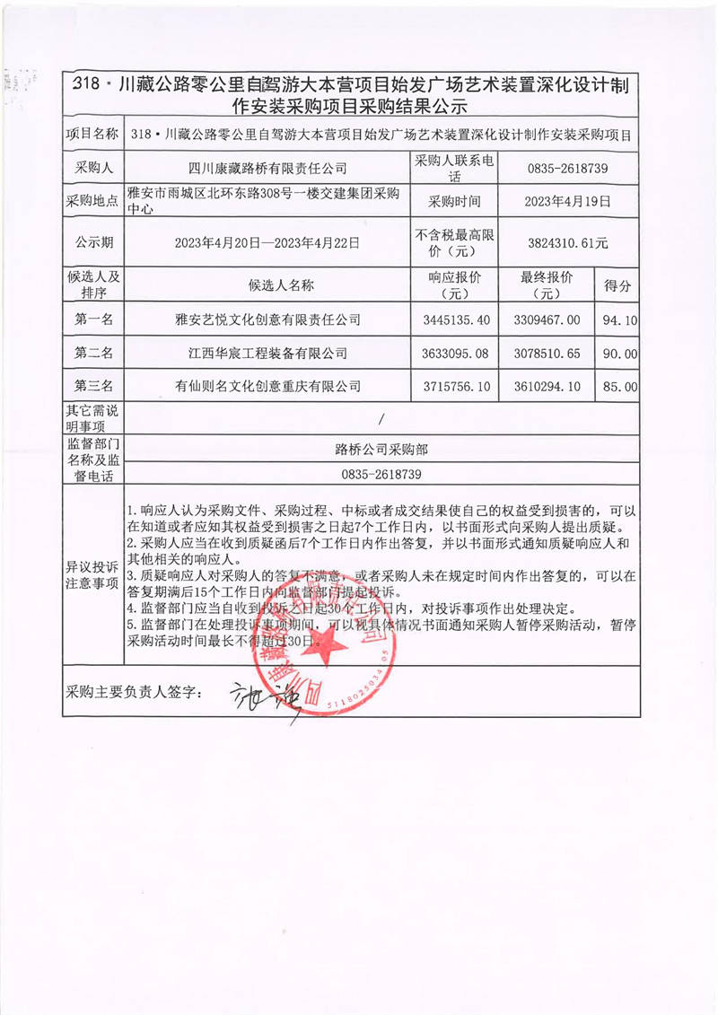 四川康藏路橋有限責(zé)任公司318·川藏公路零公里自駕游大本營項目始發(fā)廣場藝術(shù)裝置深化設(shè)計制作安裝采購項目采購結(jié)果公示